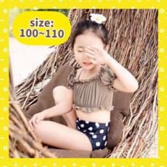 【100~110】キッズ 水着 フリル オフショルダー セパレート ドット柄