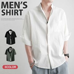 シャツ メンズ 七分袖 白シャツ 無地 カジュアルシャツ ロールアップ 大きいサイズ 2way 五分袖 綿麻風 開襟シャツ トップス ミリタリー 夏用 夏服 通勤 黒 白 40代 50代 ビジネス スタンドカラー