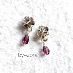 スモーキー グレー ガーネット ドロップ ビーズ ゴールド イヤリング ピアス
