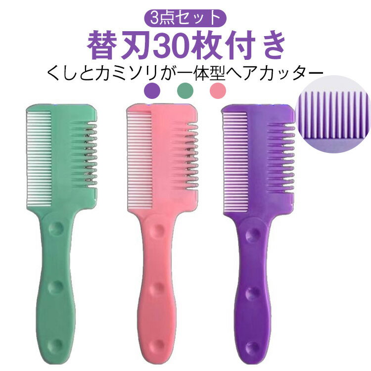 ヘアーカッター 前髪 セルフカットブラシ 3色セット!替刃30枚付き ヘアカットくし ヘアカットコーム すきカミソリ 送料無料 くし状カミソリ 自宅 散髪 前髪すき