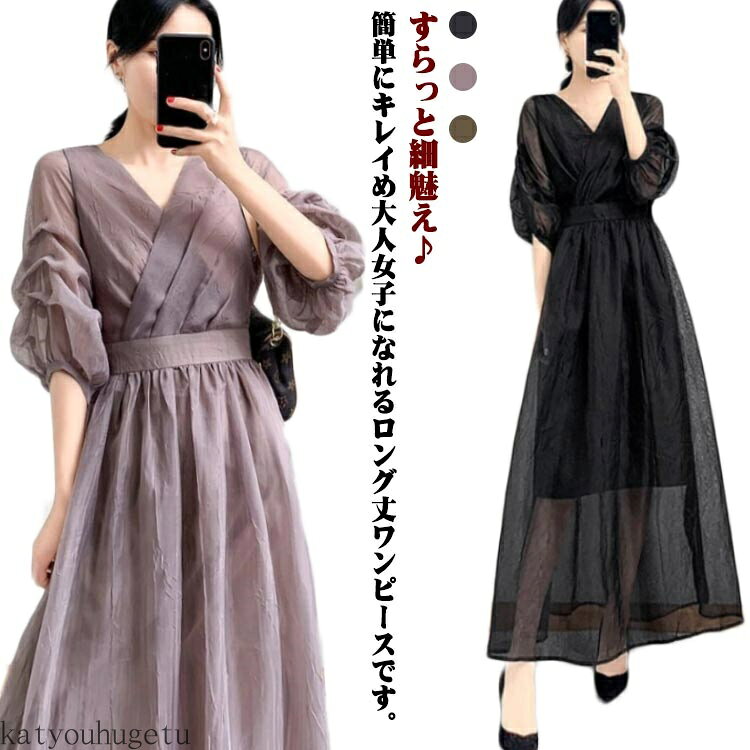 【送料無料】パーティー 着痩せ 裏地付き 7分袖 きれい ハイウエスト Vネック レディース ロング丈 レディース お洒落 結婚式 ドレス