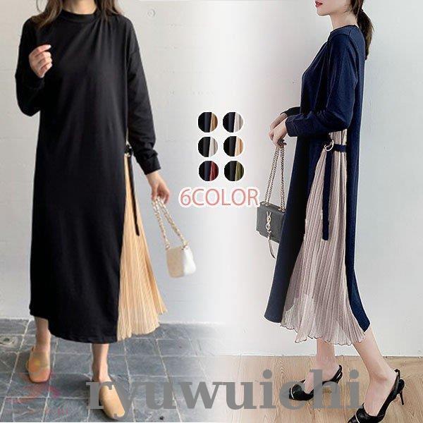 サイドプリーツワンピース レディース ミモレ丈 長袖 プリーツ ワンピース 切り替え きれいめ