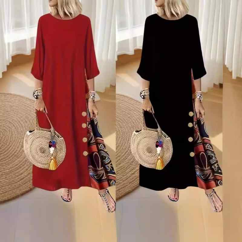 ワンピース レディース ラウンドネック 配色 ボタン 切り替え 花柄 プリント 七分袖 ロング丈 ゆったり フレアスカート ポリエステル素材 秋冬 オフィス 通勤 エレガント 上品
