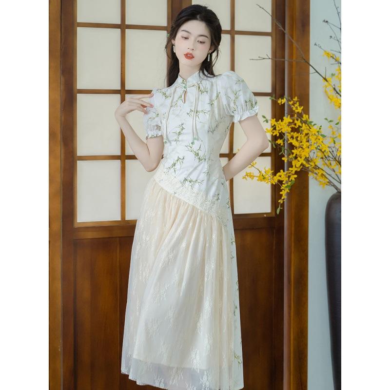 チャイナドレス レディース 新中華風 エスニック 上品 クール モダン 優美 森ガール 半袖 ミモレ丈 Aライン スタンドカラー ワンピース