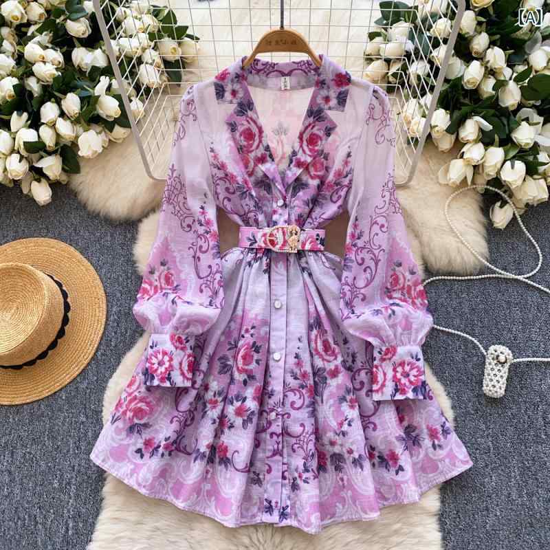 ワンピース レディース 春夏 宮廷風 レトロ クラシカル スタンドカラー 長袖 ランタンスリーブ 花柄 プリント ハイウエスト ウエストマーク ロング丈 シングルボタン Aライン セレブ風 上品 ポリエステル パープル グリーン