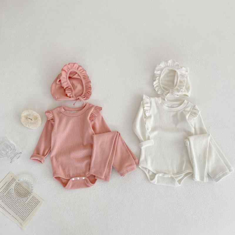 ベビー服 女の子 秋 95%綿 無地 長袖 ロンパース カバーオール 帽子 パンツ 3点セット 子供服 幼児 肌に優しい かわいい 普段着 お出かけ