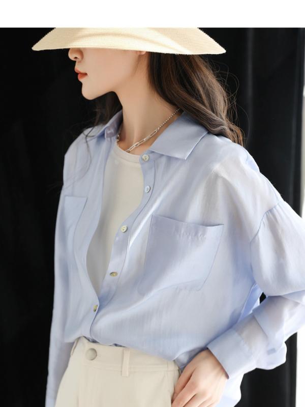シャツ レディース 再生繊維 接触冷感 ダブルポケット 長袖 ゆったり シルエット ブラウス トップス 薄手 紫外線対策 春