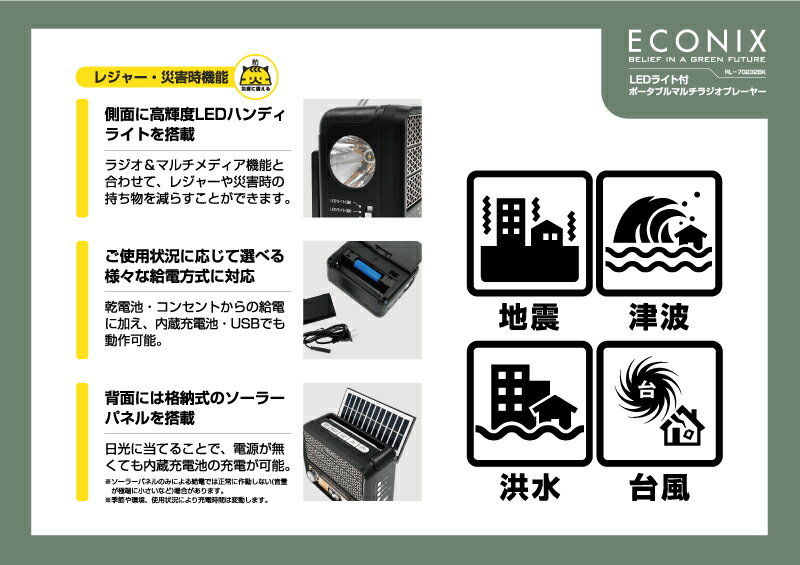 LEDライト付ポータブルマルチラジオプレーヤーは、防災や災害時に最適な多機能デバイスです。 ラジオ、ワイヤレススピーカー、LEDライトを搭載し、様々なシーンで活躍します。 4+1の給電方法により、ソーラーパネル、コンセント、乾電池、内蔵充電池、USB給電が可能で、どんな状況でも安心して使用できます。 持ち運びに便利なハンドル付きで、アウトドアや非常時の備えとしてもおすすめです。 品名:LEDライト付ポータブルマルチラジオプレーヤー
