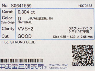 サイズ 4.35−4.39(×2.66)mm 重量 0.304ct カラー D クラリティ VVS2 カット GOOD 蛍光性 STRONG BLUE 鑑定機関 中央宝石研究所ソーティング付0.304ct D VVS2 GOOD ダイヤモンドルース クリアに澄みわたる、極上の VVS品質! お手頃価格も嬉しい、 透明感溢れる、最上級の Dカラーで、 テーブル径の キュッと締まった、 キレイな GOODカットの 一品です。 満足度の高い、美しい高級感を、 ぜひ、この機会に お楽しみください! 中央宝石研究所ソーティング付 別途 ¥3,850 にて、鑑定書作成承ります。