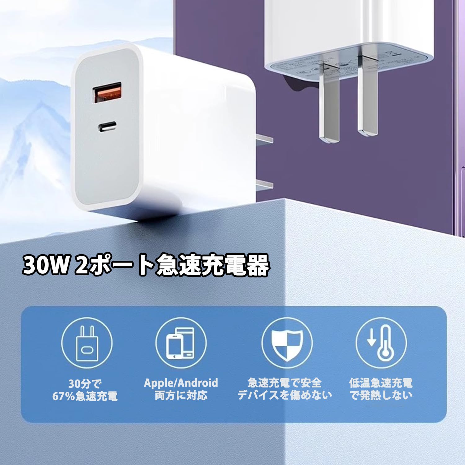 【超軽量&コンパクト設計】重さはわずか60g!手のひらサイズだから、バッグやポーチにすっきり収納可能。旅行や出張の荷物もかさばらず、自宅・オフィス・カフェなど、どこでも活躍します。コンパクト急速充電器 30W 2ポート ACアダプター USB-C & USB-A iPhone/Android対応 出張・旅行用 「30W急速充電!iPhoneもAndroidもこれ1台でOK」「2台同時充電、旅行や出張のお供に」「コンパクトなのにパワフル。持ち運びに最適」 5