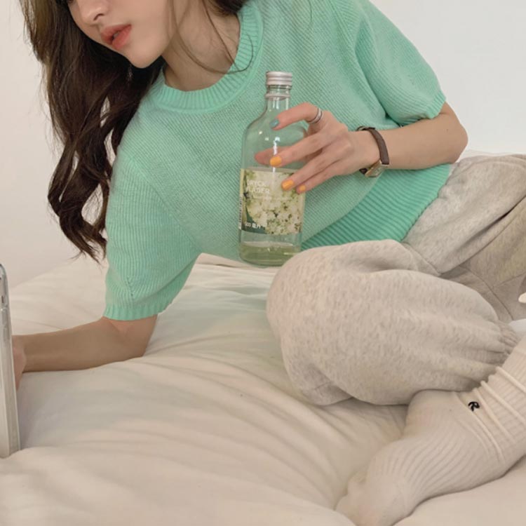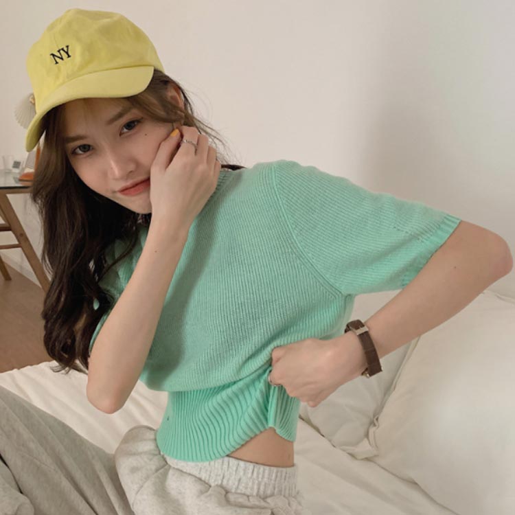 ウエストマーク サマーニット 半袖ニット 半袖 トップス カットソー ニットソー 送料無料 シンプル へそ出し ショート丈 クロップ丈 ニットソー 半袖 レディース 無地 タイト インナー 透かし編み