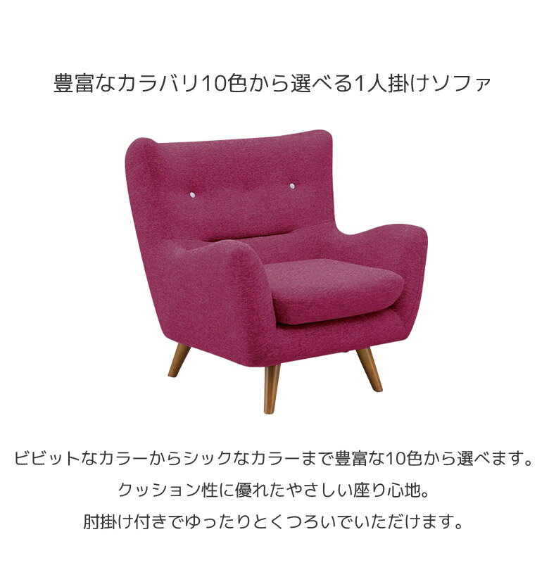 ■送料送料無料(一部地域を除く)※北海道・東北別途送料がかかります。※沖縄・離島送料は、別途お見積りとなります。大型商品は配送の都合上 ご注文承れない場合がございます。予めご了承下さい。別途送料につきましてご質問等がございましたら、お気軽にお問い合わせ下さい。※配送料について※一部配送地域により中継料などが発生し、別途追加送料をお願いする場合がございます。何卒ご了承ください。 メーカー希望小売価格はメーカーカタログに基づいて掲載していますソファ 一人掛け ファブリック 1人用 コンパクト シンプル おしゃれ 1P 肘付き 肘掛け ソファー 1人掛け 1人掛けソファー 北欧 1人掛けソファ レッド ピンク オレンジ グリーン ブルー ホワイト グレー ブラウン ブラック 関連商品