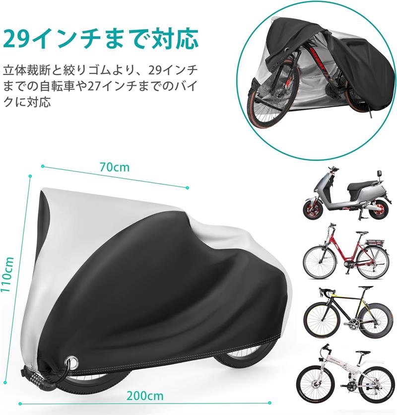 自転車カバー 210D サイクルカバー 厚手 防犯 防風 防塵 耐熱 UVカット 撥水加工 破れにくい 鍵穴盗難防止 雨雪対応き 29インチまで対応 シルバー