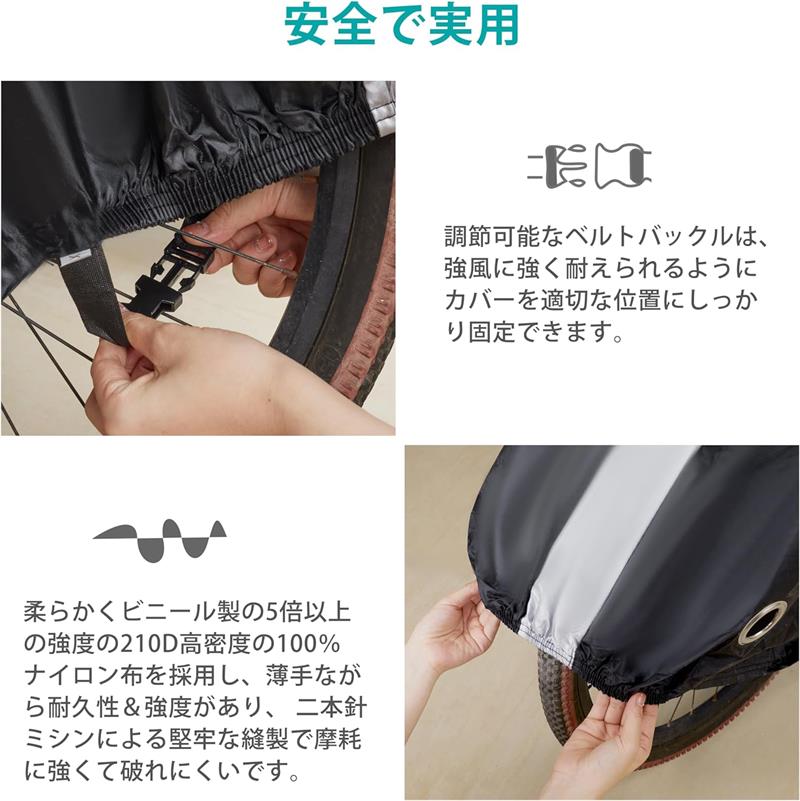 【丈夫で長持ち】生地は210D高密度の100%ナイロン布の平織り(タフタ織り)を使用し、耐久性&強度があり、この生地は柔らかくビニール製の5倍以上の強度です。 二本針ミシンによる堅牢な縫製で摩耗に強くて破れにくいです。製品長期間の継続利用を実現、大切な愛車をしっかり守ります。🚲