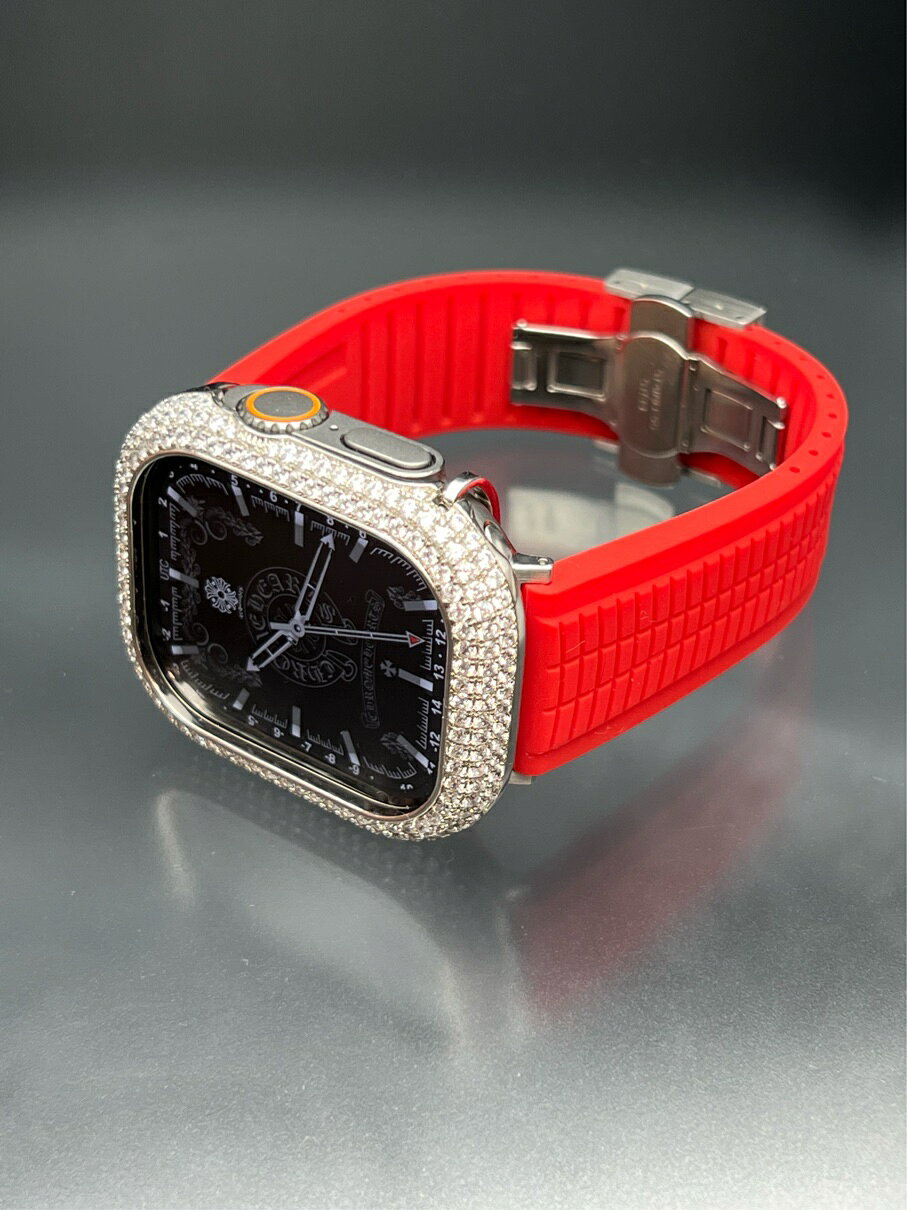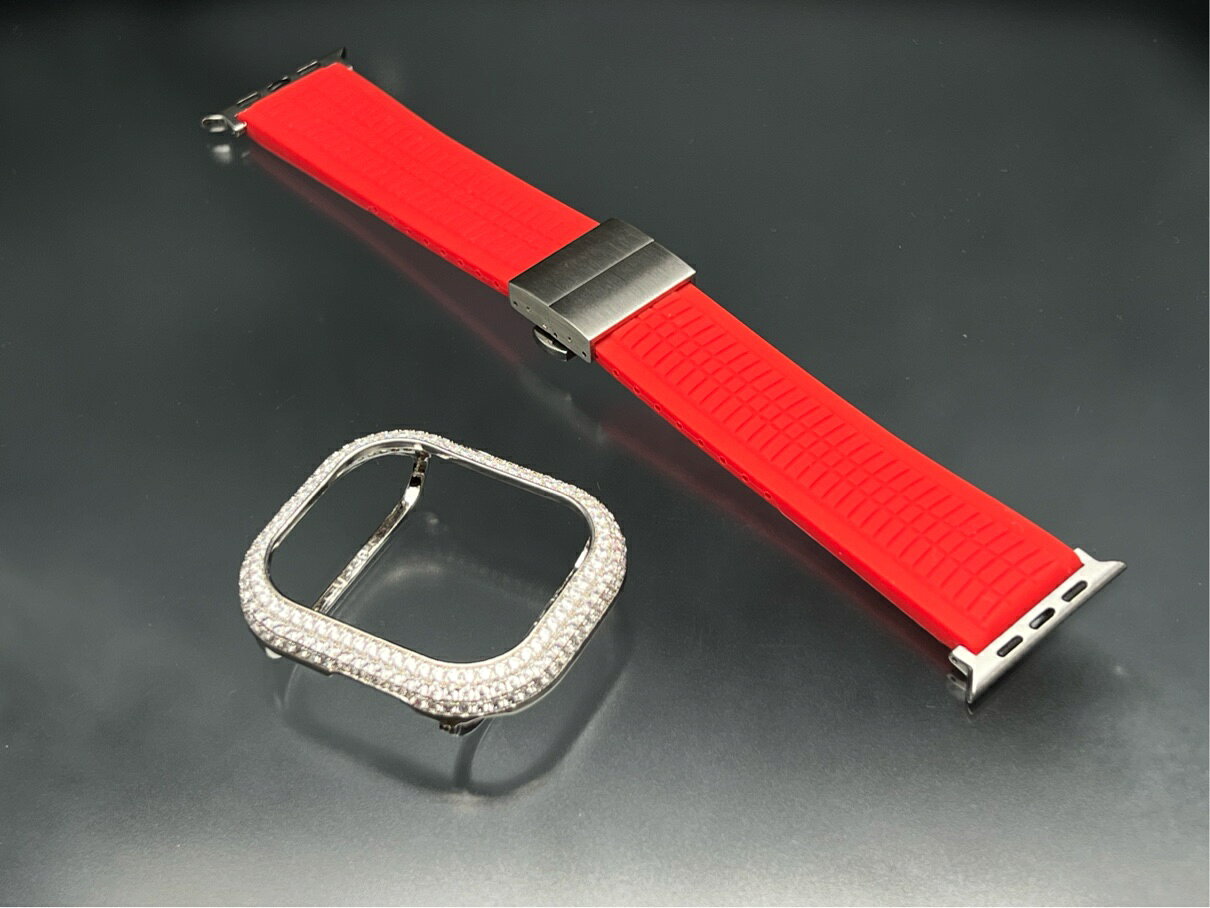 シルバー ベゼル CZダイヤモンド レッド ワイド ラバー ベルト カスタムセット アップルウォッチ 49mm 41mm 45mm 40mm 44mm アップルウォッチ用 APPLEWATCH 動画 プレゼント ウルトラ