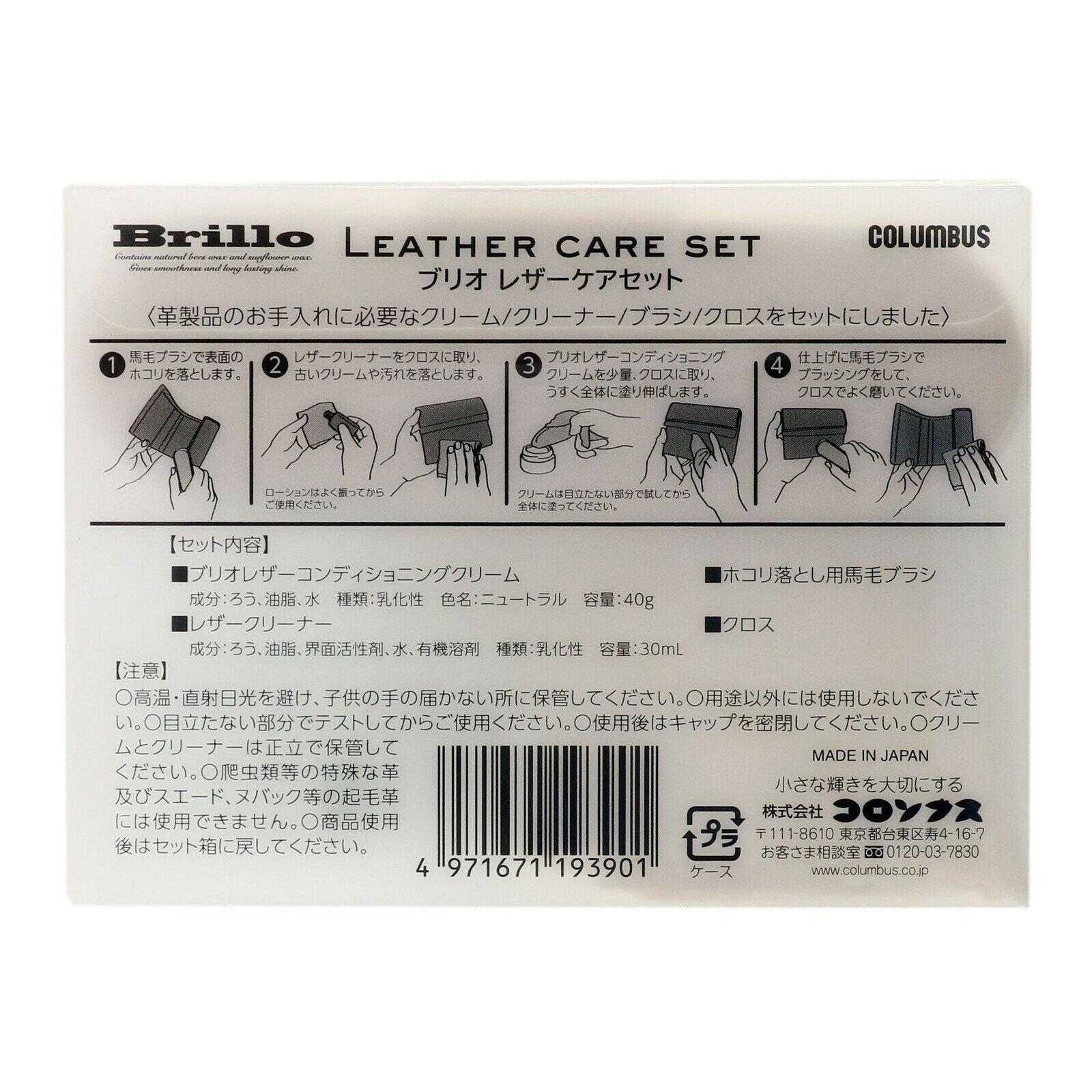 ブリオ レザーケアキット コロンブス 本革 お手入れ クリーム クリーナー 馬毛ブラシ クロス