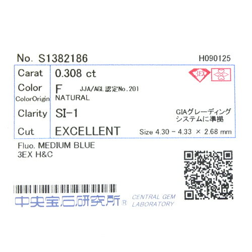 宝石 ダイヤモンド シェイプ ラウンドブリリアント カラット 0.308ct カラー F クラリティ SI1 カット 3EX HC 蛍光性 MB サイズ 4.30 - 4.33 × 2.68 mm 付属品 中央宝石研究所のソーティング※ご希望の方には中央宝石研究所のグレーディングレポート(鑑定書)を発行いたしますので、ご注文の際の選択欄で、グレーディングレポート(鑑定書)を「付ける」を選択ください(無料/納期2、3週間ほど)。 備考 ※宝石店(実店舗)にて販売中の商品です。間違いなく本物ですのでご安心ください。※ルースの商品画像はイメージ画像です。(色のイメージが違うという理由での返品は受け付けておりませんのでご注意ください。)※実物の画像をご覧になられたい場合はご注文前にお問い合わせください。+++++++++++++