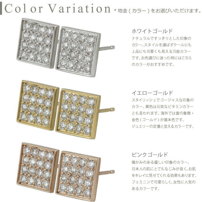 【スクエアモチーフ パヴェダイヤピアス K18ゴールド】 "パヴェ"とはフランス語で石畳を意味し、小粒(メレ)のダイヤをまるで石畳のように隙間なく敷き詰めたデザインのことです。 程よく個性を放つスクエアモチーフは、エッジの効いたスタイリッシュなシルエットが魅力。 カジュアルからフォーマルまで幅広くお使いいただけます。 いつものコーディネートのアクセントとしても◎ シーン・スタイルを選ばず使いやすいピアスは1つは持っておきたいデザイン。 落としてしまう不安や耳にかかる負担を減らしてくれる、シリコンとK18ゴールドのダブルロックキャッチを付けてお届けします。 大切な記念日や誕生日、クリスマス、ホワイトデーのプレゼントに。 また、頑張った自分へのご褒美ジュエリーにもお勧めです♪♪ 地金素材 K18ゴールド (ホワイト・イエロー・ピンクからお選びください) 使用宝石 天然ダイヤモンド 1ペア 32pcs トータル 0.50ct 大きさ 縦×横:約7.8mm×約7.8mm 厚み:約1.4mm 金具 K18ゴールドポスト 0.7mm シリコンダブルロックキャッチ付き 刻印 石目・金種 付属品 品質保証書・ジュエリーケース お届け予定 受注生産になりますので約3週間程お時間を頂いております。 その他 ・受注生産のためキャンセル、商品変更は、ご注文受付後2営業日以内にお願い致します。 ・万が一、不良品等がございました場合は7日以内にご連絡下さい。送料等、弊社負担にて迅速に誠意を持って対応させて頂きます。尚、受注生産となります為、お客様のご都合での返品はお受けする事が出来ません。 ・到着後のサイズ直しは有料となりますので、ご了承下さい。