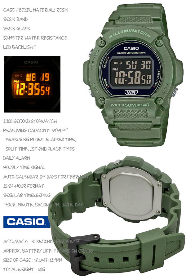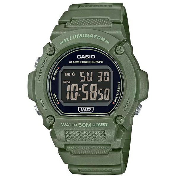 カシオ CASIO STANDARD DIGITAL 腕時計W-219HC-3B 海外モデル ★★ CASIO STANDARD ANALOG QUARTZ ★★ アースカラーシリーズのカーキグリーン・マット仕上樹脂ケースとベルトで、メンズとしてはコンパクトサイズだが、G-SHOCKのかつての名作「DW-6600 シリーズ」を彷彿させるデザインが魅力。黒の反転液晶を採用した表示画面は、スポーティでカジュアルな印象を引き立て、どんなファッションにも合わせやすい。 1/100秒計測ストップウォッチを搭載した5気圧防水に電池寿命7年のシンプルな軽量スポーツデジタルウォッチ。暗闇での視認性をサポートするLEDライトを搭載し、スポーツや軽作業など仕事やレジャーで実用腕時計としてご使用いただけます。 長時間パソコンを使うへヴィーユーザーでも、磁気帯びの心配がありません♪ 特殊な耐磁機能が付いた一部の時計以外は、針で時間を示すアナログ式の時計は、クォーツでも機械式でも、内部に歯車やモーターなどが使われており、長時間電磁波や磁気にさらされると、ムーブメントが磁気を帯びて正常に動作しなくなり、時間が狂ったる止まったりする故障の原因になります。液晶表示のクォーツ時計は内部に歯車などのパーツが無く、原理的に日常生活の範囲では磁気の影響を受けることはありません。 Item Information 構造・性能