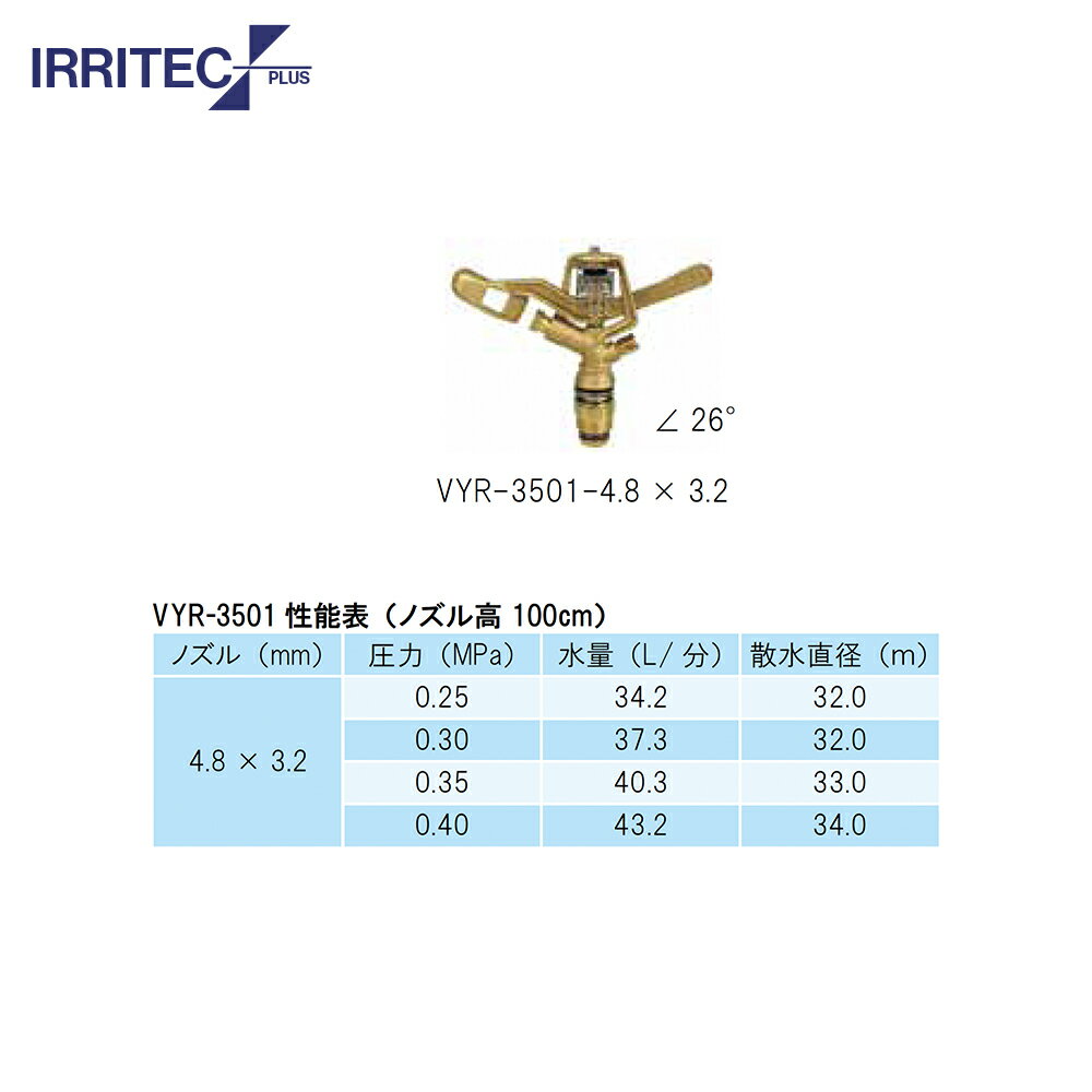 ●ノズル4.8x3.2mm:圧力(MPa)|水量 (L/ 分)|散水直径 (m) ・0.25|34.2|32.0 ・0.30|37.3|32.0 ・0.35|40.3|33.0 ・0.50|43.2|34.0
