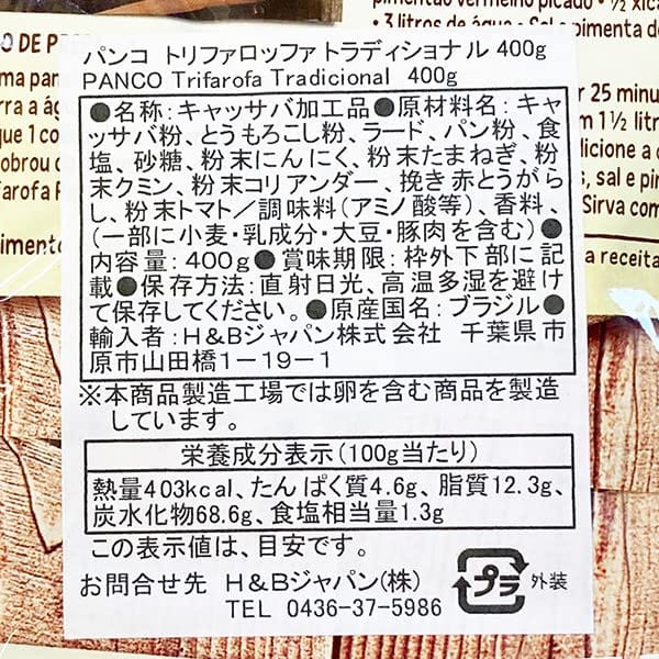 品名:ファロッファ(キャッサバ加工品)内容量:400g原材料:キャッサバ粉、とうもろこしの粉、ラスク粉、(小麦粉、砂糖)、植物油(大豆)、乾燥野菜(玉ねぎ、ニンニク、トマト等)、食塩、砂糖、香辛料、調味料(アミノ酸、イノシン酸Na)原産国::ブラジル 熱帯特産のキャッサバ芋の粉末を、じっくりローストして味つけしたファロッファ。ブラジルではシュハスコやリングイッサに添えたり、フェジョアーダなどの煮込料理に振りかけたりして食べます。