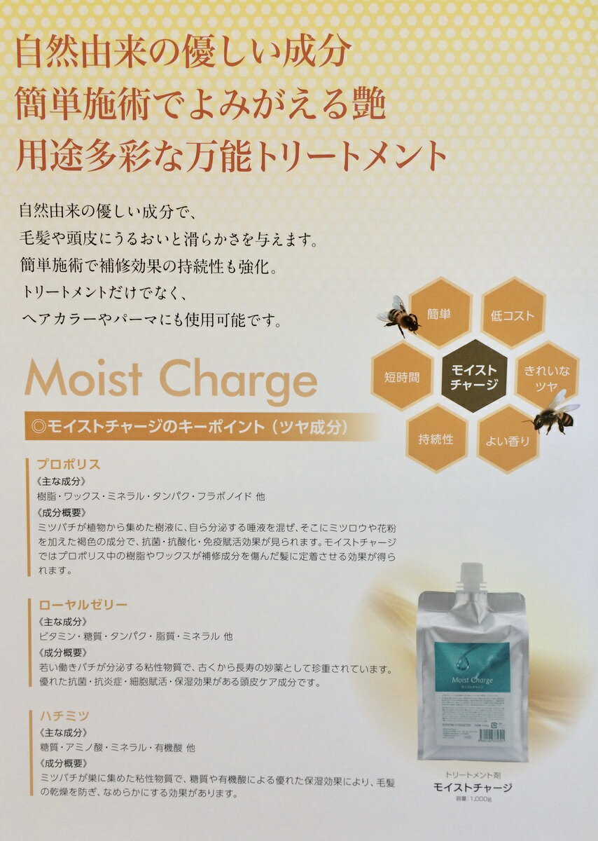 【当日15:00分まで注文商品は1〜2日以内に楽天倉庫から即日発送いたします♪】この商品は 当店で売れてる商品ですパーマ カラー 縮毛矯正 デジタルパーマ 酸熱トリートメントの施術に髪の傷んだ所に塗布すると効果的です低コスト きれいなツヤ よい香り 持続性 短時間 簡単 キーポイント成分 プロポリス 樹脂ワックス ミネラル タンパクなどをふくみ モイストチャージの毛髪補修成分を傷んだ髪に定着させますローヤルゼリー ビタミン 糖類 タンパク ミネラルなどを含みハチミツ 糖類 アミノ酸 ミネラル 有機酸などを含み 毛髪にうるおいと滑らかさを与えますサイタイエキス ニュージーランド産サラブレッドの臍帯 へその緒 のエキスでプラセンタ成分 ヒアルロン酸 アミノ酸などを含み 角質のターンオーバーを正常化させ頭皮に弾力性とハリを与えます一度ご使用なると実感を感じ取れると思います 15:00分まで注文商品は1〜2日以内に楽天倉庫即日発送1