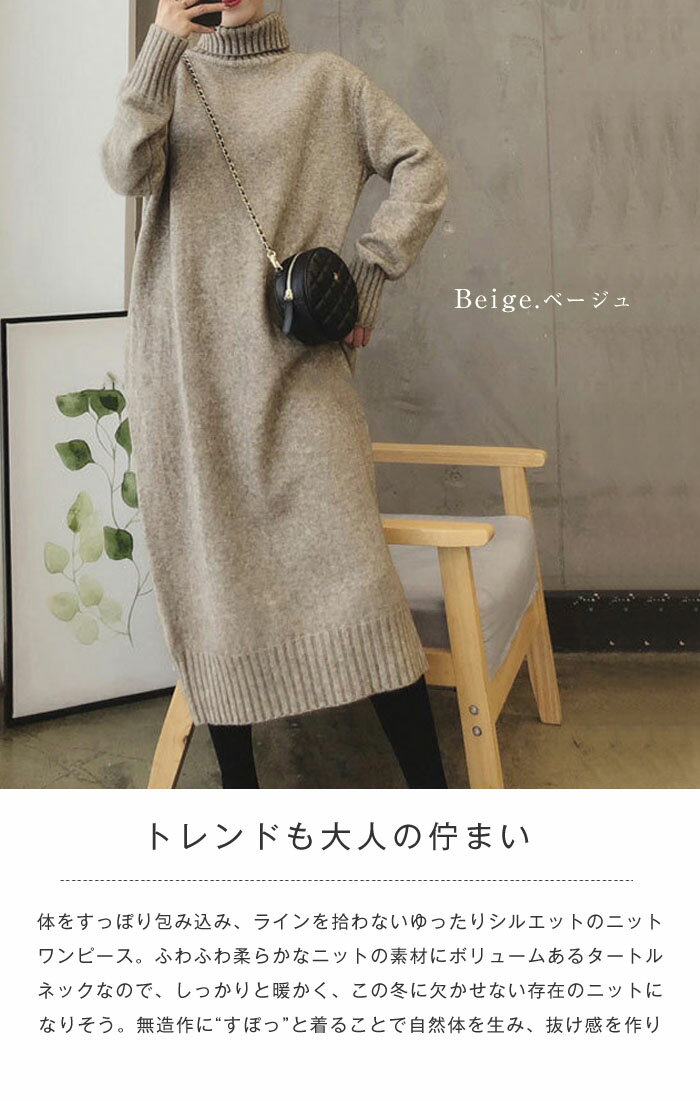 ニットワンピース ロング タートルネック チュニック ニットワンピ ワンピース ハイネック 無地 長袖 膝下丈 ゆったり ナチュラル 服 秋冬 きれいめ シンプル 30代 40代 50代