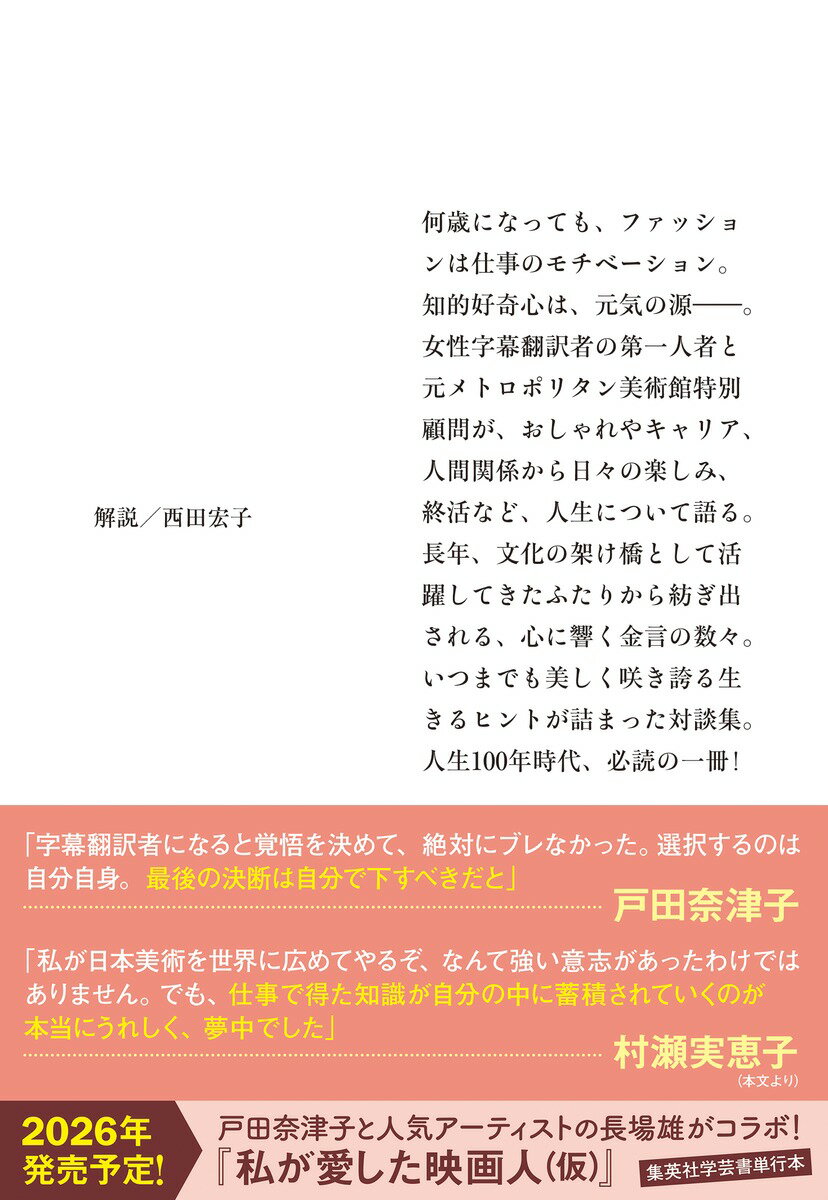 集英社文庫(日本) 戸田 奈津子 村瀬 実恵子 集英社ファッション おしゃれ 美術館 終活 キャリア 人間関係 モチベーション 展覧会 対談集 金言 知的好奇心 日本美術 人生100年時代 津田塾大学 ハリウッドスター 翻訳者 字幕翻訳 仕事の意味 カレテコソウツクシク トダ ナツコ ムラセ ミエコ 発行年月:2025年09月19日 予約締切日:2025年09月18日 ページ数:232p サイズ:文庫 ISBN:9784087448184 戸田奈津子(トダナツコ) 1936年、東京都出身。津田塾大学英文科卒業。映画字幕翻訳者・通訳。70年、映画「野性の少年」で字幕翻訳者としてデビュー。数々の映画字幕を担当。洋画字幕翻訳の第一人者としての地位を確立。ハリウッドスターとの親交も厚い 村瀬実恵子(ムラセミエコ) 1924年、樺太出身。東京女子大学英文科卒業。コロンビア大学美術史考古学部教授、メトロポリタン美術館東洋部日本美術特別顧問などを歴任。2010年、瑞宝中綬章を受章。親交のあった日本美術収集家・メアリー・バークの収集をサポート。展覧会の企画、監修などでも活躍。25年、逝去(本データはこの書籍が刊行された当時に掲載されていたものです) 1 「おしゃれ」について/2 「キャリア」について/3 「運命の出会い」について/4 「仕事の意味」について/5 「美」について/6 「楽しみ」について/7 「人との付き合い」について/8 「終活」について 何歳になっても、ファッションは仕事のモチベーション。知的好奇心は、元気の源ー。女性字幕翻訳者の第一人者と元メトロポリタン美術館特別顧問が、おしゃれやキャリア、人間関係から日々の楽しみ、終活など、人生について語る。長年、文化の架け橋として活躍してきたふたりから紡ぎ出される、心に響く金言の数々。いつまでも美しく咲き誇る生きるヒントが詰まった対談集。人生100年時代、必読の一冊! 本 小説・エッセイ エッセイ エッセイ 小説・エッセイ ノンフィクション 文庫(ノンフィクション) 文庫 人文・思想・社会