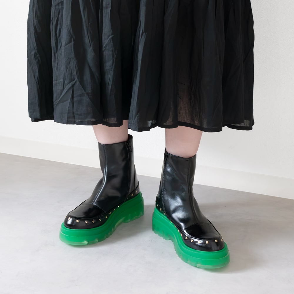 スペインブランド CHIE MIHARAの個性派ショートブーツです。CHIE MIHARAの今シーズンの特徴でもあるクリアソールをグリーンのソールに重ね、一際注目度の高いショートブーツが誕生しました。グリーンのソールだけだと主張も強くなってしまいますが、程よくフチの色がボカされ、未来感のあるシューズになっています。小さなゴールドスタッズで縁取っている点や、ストレートチップや踵に艶のあるエナメルを使用しているのも特徴的で格好いいポイントです。 ボリュームもあるのでソールに重さはありますが、丈夫さと安定感が増すのも特徴です。