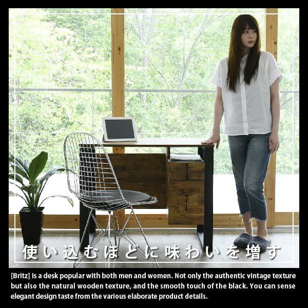 ■商品説明 カフェの雰囲気を演出できる、ヴィンテージ風シートがおしゃれなブルックリンスタイルのデスク。無骨すぎないデザインで男女問わずご使用いただけます。便利な大小2杯の引き出し付きで、下段にはA4ファイルも収納可能。