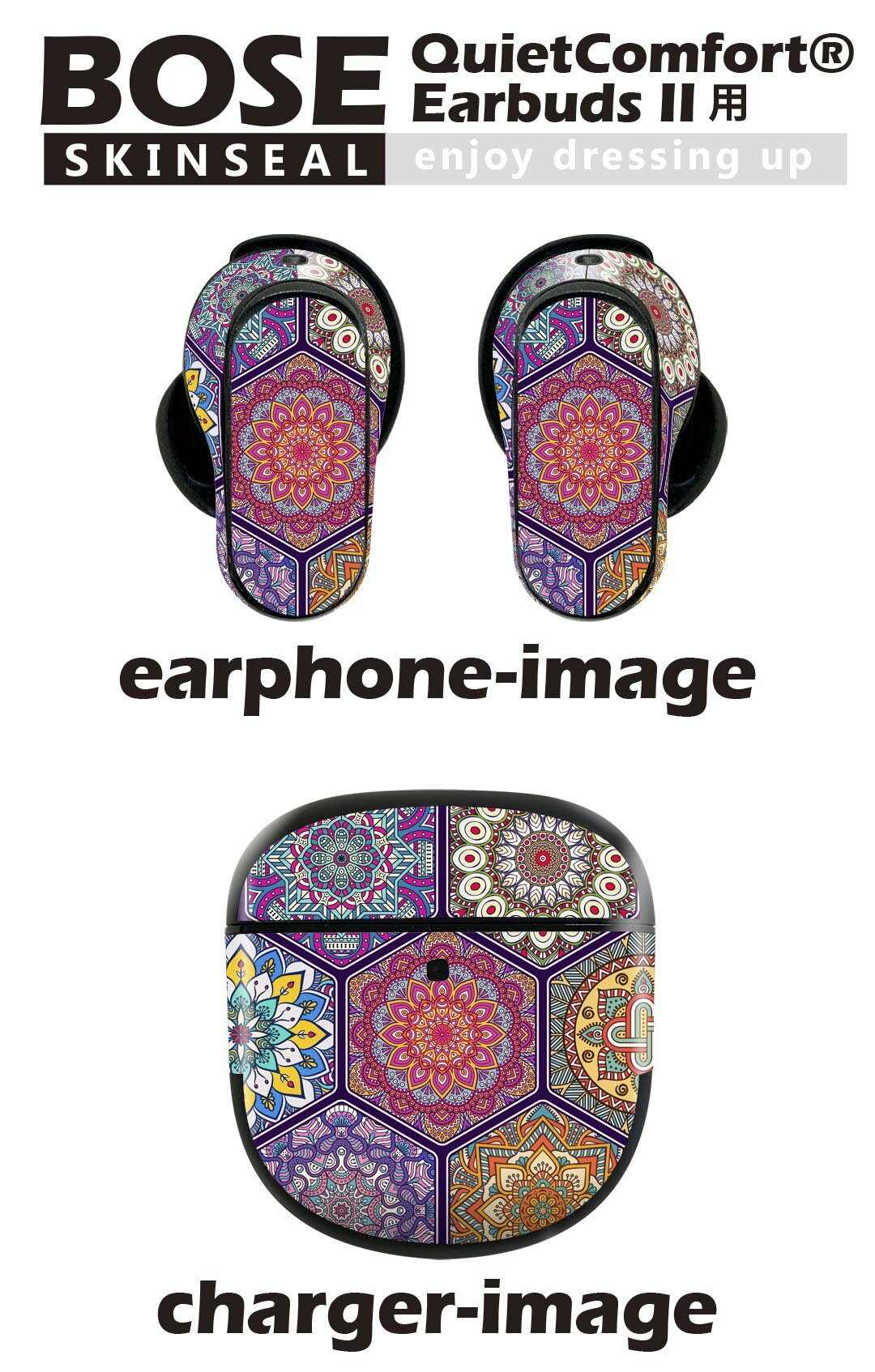 Bose QuietComfort Earbuds II 用 スキンシール ボーズ イヤバッズ2 用 ステッカー 本体3セット ケース1セット 保護 フィルム デコ アジアン 模様 カラフル 010131