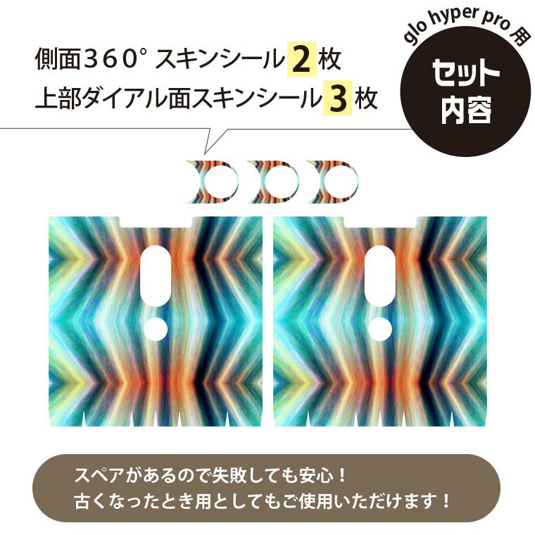 商品特徴・貼るだけでかんたん着せ替え、glo hyper pro 専用デザインスキンシール・高精細プリントで写真と遜色のない仕上がり!半光沢シートでしっとりツヤのある表現力・側面2枚に加え、天面3枚がセットで失敗しても安心!・ちょっとしたすり傷からglo hyper pro 本体を保護・接着部はエアフリー素材で気泡の心配も軽減・再剥離素材なので貼り付け時の調整も安心注意事項画像はサンプルですので、ご覧の環境によっては多少色味に違いを感じる場合がございます。 イメージと違った、モニターと色味が異なるという理由での交換や返金はご対応出来かねます。スキンシールのみの販売で、glo hyper pro 本体は付属しません。初回貼付時の位置調整や貼り直しは可能ですが、しっかりと押し付けて接着させた後の再剥離、再利用は保証しておりません。また接着部に油分や汚れが付着しますと角の部分は剥がれやすくなりますので、貼付時はあまり触れないようにご注意ください。無地のセミグロスシートにデザインをプリントした商品で、デコなどの加工はございません。 凹凸や光沢があるように見えたり布地や金属を素材にしたように見える商品もありますが、デザインの図版によるものです。印刷時に微妙な画像のズレが生じる場合がございます。ご注文後に1点1点制作する受注生産品の為、不良品以外のご返品や交換は固くお断りします。 発送について完全受注生産のハンドメイド商品となりますので、既製品と比べて発送までお時間を頂いています。 基本的に決済確認後、最大で5営業日での発送となります。繁忙期や休業日明けの場合はさらに時間がかかる場合があります。 その際には別途メールにてご連絡致します。メール便の場合、発送日から到着までに2?4日ほどかかる場合が多く、紛失などの保障もご対応できかねます。あらかじめご了承下さい。