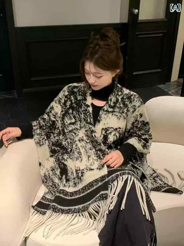 レディース 秋冬 ショール ケープ コート レトロ 水墨画風 花柄 両面 ウール混 高級感 フリンジ 防寒 スタイリッシュ ロング丈 軽量 暖か