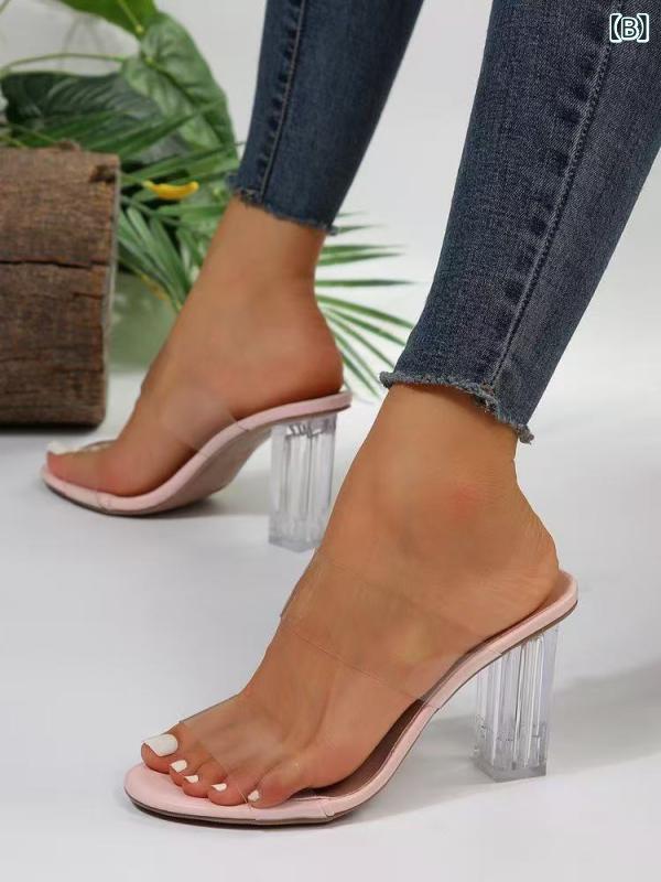 ハイヒールサンダル レディース 厚底ヒール スクエアトゥ シングルストラップ 透明素材 クリアシューズ 春夏 大きいサイズ シンプルデザイン 欧米スタイル 女性用 夏足元 オープントゥ チャンキーヒール ミニマルファッション ビッグフィット ウェスタンカ