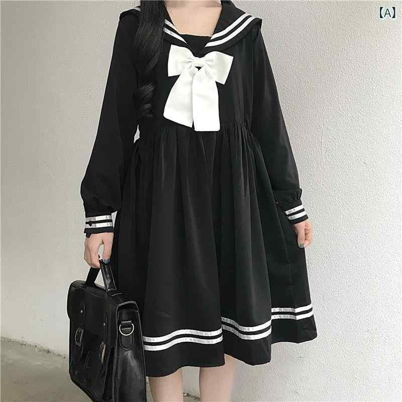 ワンピース レディース 長袖 学院風 韓国風 ゆったり 中長丈 セーラーカラー ドールスカート 小清新 学生服風 ナチュラル