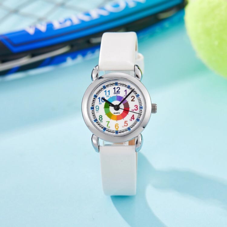 分かりやすい知育腕時計。1時間ごとの「色分け」の直感的なデザイン、子供が楽しく学べるおしゃれなキッズウォッチ。1時間ごとの「色分け」と1分単位の表示で、すぐに読めるようになるので、こども自ら時間を言いたくなる知育腕時計です。生活防水なので雨や手洗いなど気にせずお使いいただけます。時間の流れが実感できるおしゃれなアナログキッズ腕時計です。 サイズ F サイズについての説明 素材 色 ホワイト レッド ブルー ブラック ピンク ローズ パープル 備考