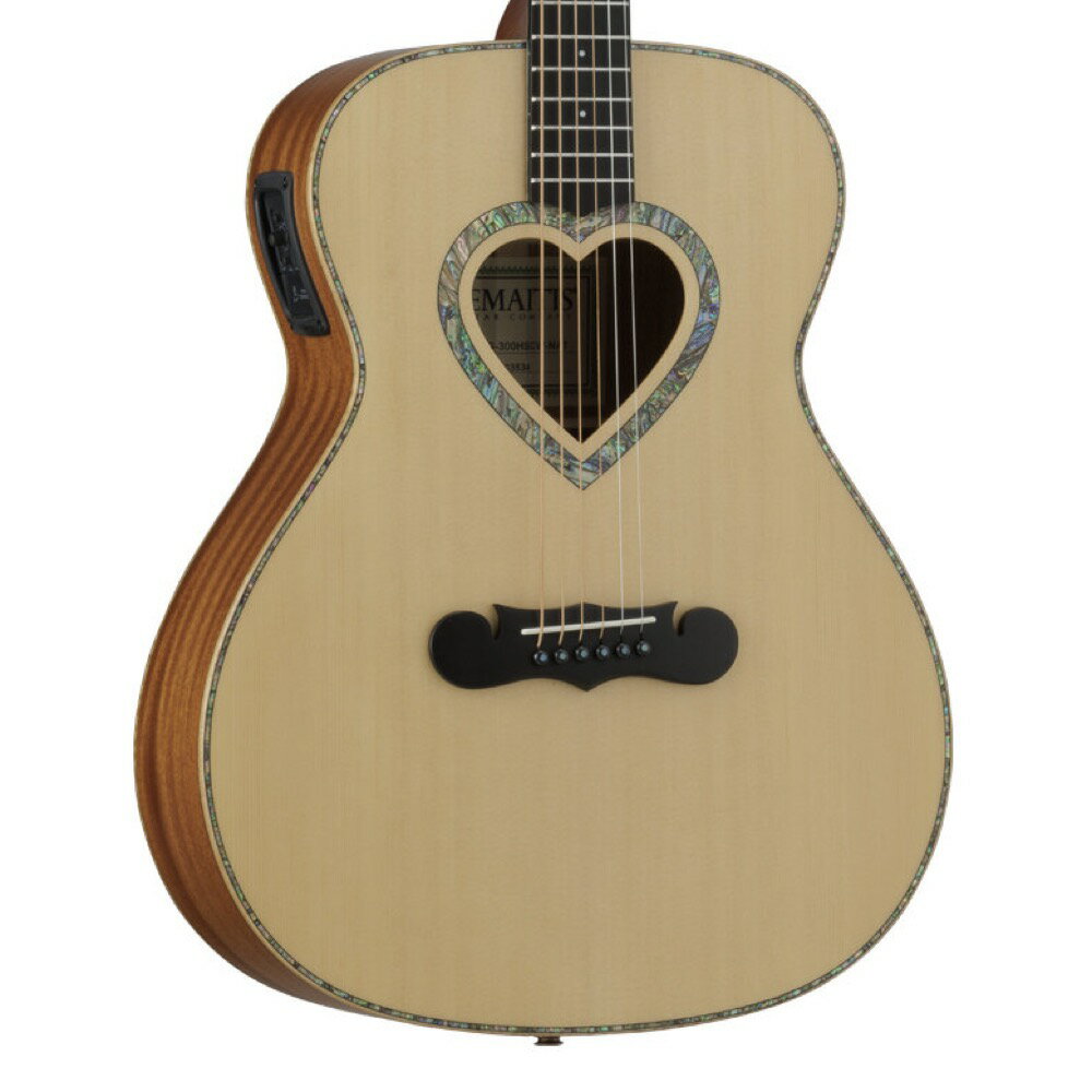 ZEMAITIS CAG-300HS Natural エレクトリックアコースティックギターゼマイティス・エレクトリック・アコースティック・ギターに、フィンガー・ピッカーにも人気の高い小振りなグランド・オーディトリアム・ボディーのCAG-300HSが加わりました。ボディーは板材の時に真空状態で熱を加えることで余分な水分やミネラルを取り除いたAAグレードのソリッド・シトカ・スプルースをトップに、マホガニーをサイドとバックに使用しています。トップ・ブレイシングは、最大限の鳴りを引き出すためにサウンドホールの形状やボディーのサイズを考慮して設計したフォワードXブレイシングを採用しています。フィンガーボードとブリッジはエボニーです。アンダーサドル・ピックアップを備えたプリアンプ・システムは、ヴォリューム、3バンド・イコライザー、チューナー、ノッチ・フィルター、フェイズ・スイッチを装備したL. R. BaggsのStagepro Elementで、ボディー・サイドのコントロールにて緻密なサウンドメイクもお手元で実現します。マザー・オブ・パールを使用したZヘッド・ロゴ、アバロン・ロゼッタの装飾を備えたハート・サウンドホールなど、ゼマイティスならではのデザインも魅力的なエレクトリック・アコースティック・ギターです。カラーはナチュラルで、ネック、ボディー共にサテン・フィニッシュです。Top:Solid Sitka SpruceBack & Sides:MahoganyBracing:Forward XNeck:MahoganyNeck Joint:14thNut Width:1 11/16” (43mm)Fingerboard:EbonyBridge:EbonyFretboard Radius:16” (406mm)Nut & Saddle:BoneScale Length:25 1/2” (648mm)Frets:19Finish:Polyurethane Semi GlossBody Length:504mmBody Width (Upper Bout):293mmBody Width (Lower Bout):402mmBody Depth (Upper):95mmBody Depth (Lower):120mmSoundhole Shape:HeartRosette Material:AbaloneHeadstock Veneer:EbonyStrings:Phosphor Bronze (.012, .016, .024, .032, .042, .053)Preamp:L.R. Baggs Stagepro ElementCase:Semi Hardcase