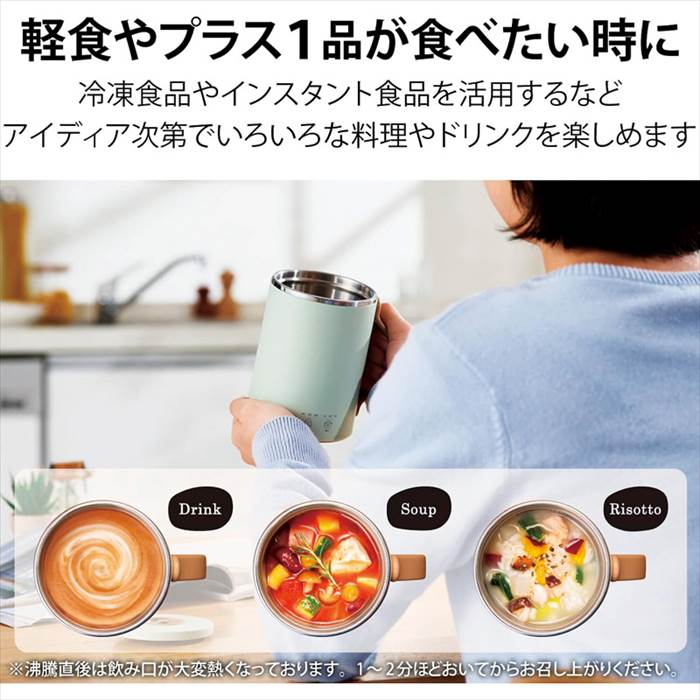 ■商品紹介:手軽に「沸かす・煮る・保温する」ができるマグカップ。保温と温め直しを組み合わせて、長時間にわたって食事を楽しめます。スイッチを押すだけの簡単操作。