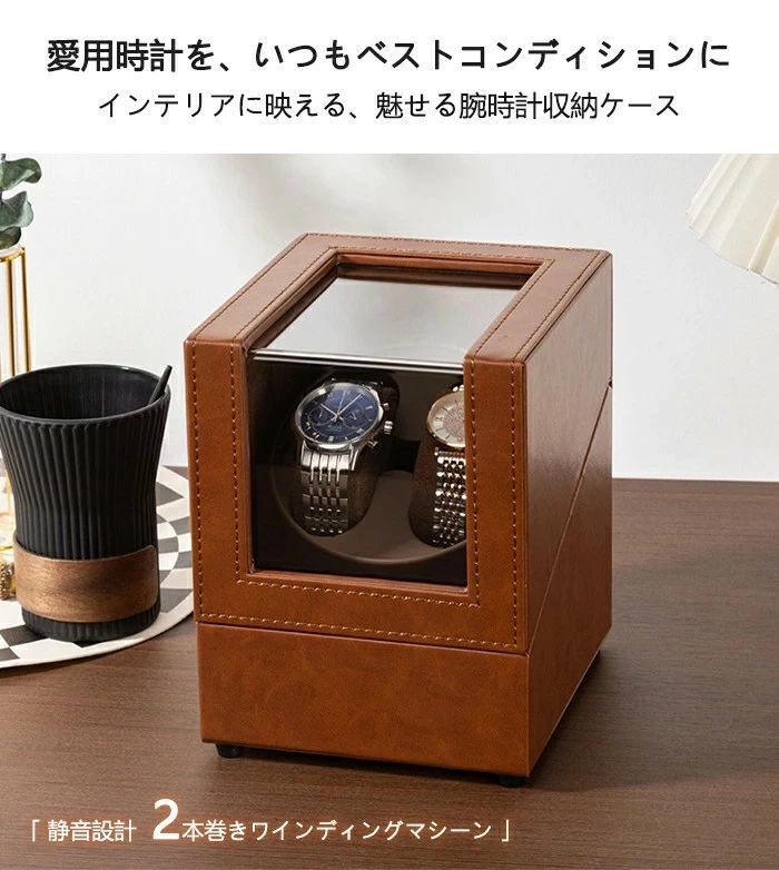 商品説明: 大切な自動巻き腕時計を、いつでもベストな状態で。 インテリアにもなる、静音設計2本巻きワインディングマシーン。 お気に入りの自動巻き腕時計、使わない間に止まってしまい、時刻合わせやゼンマイを巻くのが面倒だ と感じていませんか?このウォッチワインダーは、腕時計をセットしておくだけで自動でゼンマイを 巻き上げ、いつでも使える状態に保ちます。高級感あふれるデザインは、大切な時計を美しくディス プレイする「腕時計収納ケース」としても活躍。書斎や寝室のインテリアをワンランクアップさせます。