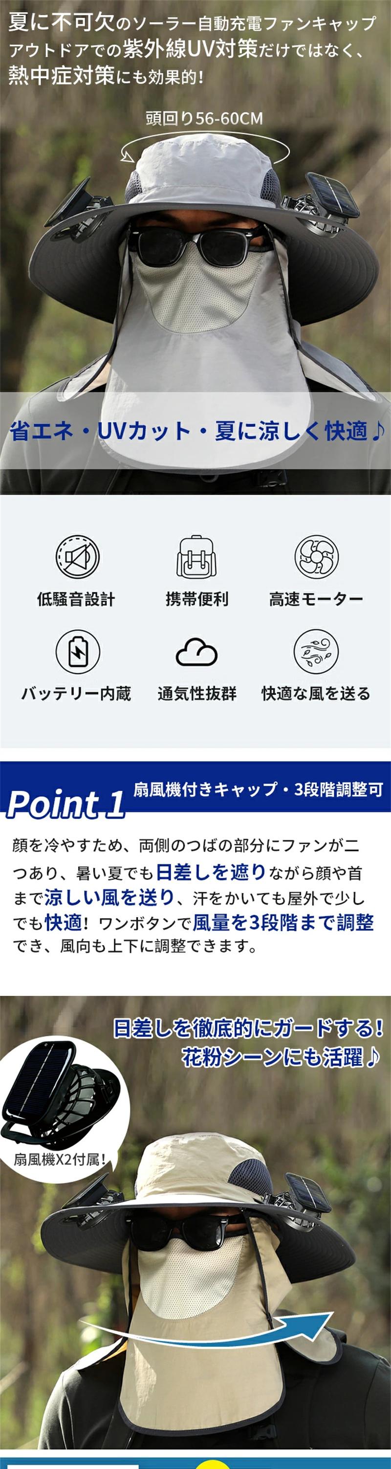 商品情報商品名:扇風機付き帽子帽子のつば:約12cm帽子の深さ:約10cm充電時間:約3時間連続使用時間:SUNの段階で約7時間連続使用(USB充電)頭回り:56〜60cm素材:ABSセット内容::帽子X1、扇風機X2、USBケーブル生産国:中国(日本スタッフによる安心の検品体制)
