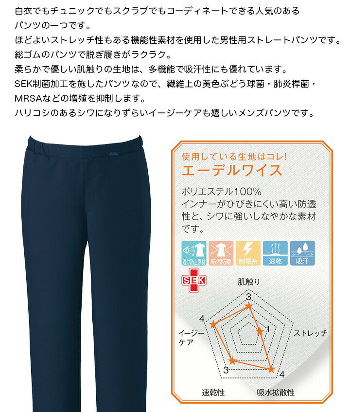■素材 エーデルワイス(ポリエステル100%) ・総ゴム ・両脇ポケット ・ウエストひも入り ほどよいストレッチ性もある機能性素材を使用した男性用ストレートパンツです。総ゴムのパンツで脱ぎ履きがラクラク。柔らかで優しい肌触りの生地は、多機能で吸汗性にも優れています。SEK制菌加工を施したパンツなので、繊維上の黄色ぶどう球菌・肺炎桿菌・MRSAなどの増殖を抑制します。ハリコシのあるシワになりずらいイージーケアも嬉しいメンズパンツです。 注意 ※商品画像について パソコン環境により多少の色誤差が生じますことを予めご容赦ください。関連アイテムはこちら メンズジップスクラブ メンズパンツ メンズパンツ レディースジップスクラブ レディースストレートパンツ レディースストレートパンツ