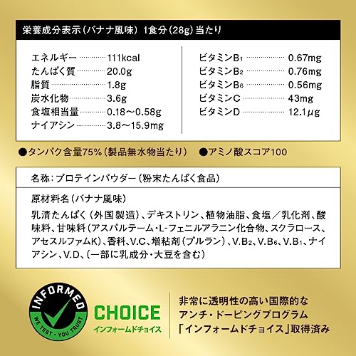 ●当社独自の造粒方法や配合で、プロテインの溶けやすさを追求しています。溶けやすいのでシェイカーだけでなく、グラスやコップでも簡単に溶かせておいしくお飲みいただけます。 原材料・成分 乳清たんぱく(外国製造)、デキストリン、植物油脂、食塩/乳化剤、酸味料、甘味料(アスパルテーム・L-フェニルアラニン化合物、スクラロース、アセスルファムK)、香料、V.C、増粘剤(プルラン)、V.B2、V.B6、V.B1、ナイアシン、V.D、(一部に乳成分・大豆を含む) 1食(28g)当たり:エネルギー111kcal たんぱく質20g 脂質1.8g 炭水化物3.6g 食塩相当量0.18-0.58g ナイアシン当量3.8-15.9mg ビタミンB10.67mg ビタミンB20.76mg ビタミンB60.56mg ビタミンC43mg ビタミンD12.1μg 使用方法