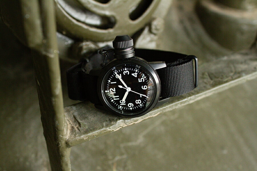 メーカー:M.R.M.W. モントルロロイ ミリタリーウォッチ製品名:BBO-10FBJANコード:4570027531086ケースサイズ:横32mm(リュウズ含まず)x 42.5mm(リュウズ含む)x 縦39.55mm x厚み13.5mmケース:ステンレススチールバンド:16mm幅布地コットン1ピース型深黒色ベルト(腕首周りサイズ約16.5cm〜20cm)ムーブメント:12時間クォーツムーブメント:日本製 ・携帯頻度(常温):平均月差15秒(基準)ガラス:ドーム型ミネラルガラス製防水:5ATM(5気圧防水):日常防水レベルで、深水可能なダイバーウォッチのレベルではありません。説明:米軍は1940年代にUDT(水中爆破チーム)隊員向けにBuships 時計を開発しました。Bushipsは、その愛嬌のあるボディから”キャンティーン”(水筒)UDTチームの呼び名から”フロッグマン“(蛙男)等の呼び名があり長年愛されているモデルです。リクエストに応えBushipsに待望のオールブラックシリーズどんなシーンにも色にもマッチするブラックシリーズは2種展開です。 Buship Black Ops ブシップス・ブラックオプス UDTの任務は敵に隠れ海から忍び込み、後から来る味方を上陸させるのに邪魔な障害物を爆発物をしかけ排除する事にありました。それゆえ敵地で捕まっても、身分が判るようなものは持参していなかったと聞きます。実際にはブラックカラーのBushipsは存在していませんでした。ブラックオプスとはブラック・オペレーションの略で、非公式作戦(black operation、black op、ブラックオプス)を意味します。ブラックIPを施したステンレスケースに黒文字盤、ホワイトインデックスが、これ以上ない視認性を実現。IPブラックモデルは実存していないだけに非公式作戦という名がしっくりきます。M.R.M.W. モントルロロイ ミリタリーウォッチ Buships UDT ブシップス BBO-10FBメーカー希望小売価格はメーカーカタログに基づいて掲載していますM.R.M.W. モントルロロイ ミリタリーウォッチ Buships UDT ブシップス BBO-10FB