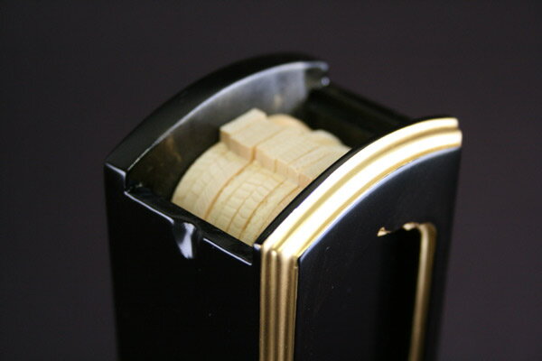 【サイズ詳細】 塗り 艶消し塗り仕様 加飾 本金粉使用 外寸サイズ 札規格:6.0寸(約180ミリ) 寸法 総高283×総幅135×総奥行75ミリ 中板サイズ 長さ163×幅59ミリ 板枚数 白木板:9枚/黒塗り板:1枚 ご先祖様が多い場合に位牌をまとめるために使う位牌 です。 また名古屋地区をはじめ東海地方では浄土真宗 の方がお仏壇用の位牌として使用するのがこの位牌で す。 中に入っている白木の板に法名や戒名を墨で書き入れ て位牌とします。(一般的にはお寺様にお願いして書い て頂きます。) ご法事のときは法事にあたる方の板を一番前に出すこ とから『回出し位牌(回り出し位牌)』『繰出し位牌(繰 り出し位牌)』『繰り位牌』などと呼ばれています。