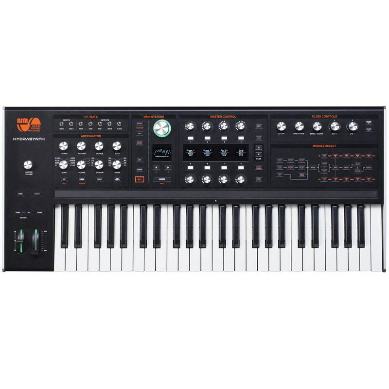 ■ 日本語取扱説明書について 現在メーカーにて鋭意製作中です。作成完了後、pdfにてオフィシャルサイトにて配布される予定となっております。ご迷惑をお掛け致しますが、完成まで暫くお待ち下さいませ。※沖縄・離島等、一部の地域へのご配送は別途送料お見積もりとなります。お気軽にお問い合わせ下さい。Hydrasynthは8ボイス、3オシレーターシンセサイザーで、独自のウェーブモーフィングシンセシスエンジンを採用しています。OSC 1、OSC 2、OSC 3は、219種類のシングルサイクル波形から1つを選ぶことができます。また、Wave Scanモード(OSC 1およびOSC 2のみ)は8種類の波形を定義してリストを作成し、モジュレーションソースを使用して1つずつモーフィングできる柔軟性の高いモードです。前述のシンセシスエンジンにはミューテーターも搭載されており、詳細なトーンの変更を行うことができます。MUTANT 1、MUTANT 2、MUTANT 3、MUTANT 4は、複雑なFM音源(周波数変調)を実現します。それぞれハードシンク、ハーモニックスイープ、WavestackTMという3種類のパルス幅変調機能を備え、入力した波形のデチューンを5個生成して極めて密度の高いサウンドを生み出します。また、ミューテーター内は柔軟なルーティングが可能なため、サウンドの微調整や歪みサウンドの生成、サウンドの逆再生を(ほぼ)無制限に行うことができます。さらに、シンセシスエンジンには、並列または直列に構成できる2つのフィルターも搭載されています。FILTER 1では新しいフィルターからクラシックなフィルターまで、11個のフィルターモデルを使用できます。FILTER 2は連続可変マルチモードフィルターです。ルーピングやテンポ同期ができる5つのエンベロープジェネレーター(ENV 1、ENV 2、ENV 3、ENV 4、およびENV 5)、ステップシーケンサーやワンショットで使用できる5つのLFO(低周波数オシレーター、LFO 1、LFO 2、LFO 3、LFO 4、およびLFO 5)などのモジュレーションソースにより、最も必要とされる動きを合成サウンドに追加できるHydrasynthは、期待を裏切りません。MOD MATRIX(モジュレーションマトリックス)にはソースをモジュレーション先にルーティングする32個のモジュレーションスロットが用意されています。このソースとモジュレーション先は、MIDI(Musical Instrument DigitalInterface)CC(Continuous Controller)メッセージ経由で送受信したり、フロントパネルから操作可能なCV(ControlVoltage)入出力で操作したりすることができます。また、このように本格的なMIDI(5ピンDINのMIDI IN、MIDI OUT、MIDI THRおよびUSB接続にも対応した通常接続を使用)のほか、CV/GATE接続(ユーロラックモジュラーギア、ビンテージシンセサイザーなどの今ある広大な製品とともに使用可能)が搭載されているため、接続性は限りなく広がります。Hydrasynthは、シンセサイザーとコントローラーに最も求められている機能の1つである、ポリフォニックアフタータッチを復活させました。他にはないこのポリフォニックアフタータッチキーボードが、単調なサウンドに生命とダイナミクスを吹き込みます。ユーザーは標準サイズの従来のキーボードを使用して表現力豊かなパッセージを作成できます。PolytouchTMキーボードでの演奏や操作に、新たなキーボードテクニックを学ぶ必要はありません。スタジオやステージのセットアップに別のキーボードを追加する必要がない場合は、PolytouchTMキーボードとユーザー割り当て可能なリボンコントローラーを省いた、24ベロシティおよびポリフォニックアフタータッチ対応パッド搭載のHydrasynthデスクトップバージョンが便利です。調整可能なARPEGGIATORや専用のFILTER CONTROLSなど、他のすべてのパフォーマンス属性は搭載されています。このASMの最初のハードウェア製品には両方のバージョンとも、視覚的なフィードバックを提供する鮮明なOLED(有機発光ダイオード)ディスプレイがフロントパネル全体に分かりやすく設置されており、センセーショナルなシンセシスエンジンを求めている場合に最適な製品です。技術仕様 タイプ: ポリフォニック・ウェーブ・モーフィング・シンセサイザーサウンドエンジンタイプ: ウェーブスキャンアナログ/デジタル: デジタル鍵盤数 49鍵盤タイプ ベロシティ付き ASM POLYTOUCH ポリフォニック・アフタータッチ対応鍵盤その他のコントローラー リボンコントローラー、ピッチベンダー、モジュレーションホイール同時発音数 8ボイスプリセット数 640オシレーター: 3 x ウェーブスキャンオシレーター(219波形)、4 x MutatorウェーブシェイパーMutator: 7タイプ(リニアFM・Waveスタック・PW-オリジナル・PW-スクイーズ)・PW-ASM・ハーモニックスウィープ・ハードシンク)LFO: 1ボイスにつき5基(サイン波・三角波・上昇ノコギリ波・下降ノコギリ波・矩形波・パルス波27%・パルス波13%・サンプル&ホールド・ノイズ・ランダム・ステップ)テンポシンク対応エンベロープ: 1ボイスにつき5基。テンポシンク対応フィルタータイプ: 1 x マルチモードフィルター(11タイプ)、1 x バリアブルL