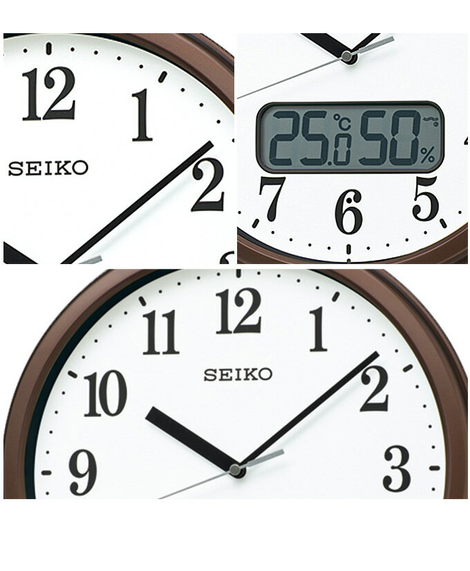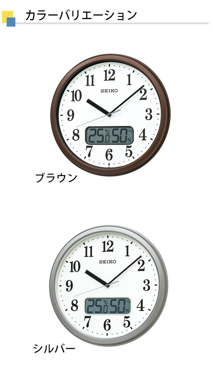 掛け時計 スタンダード 液晶表示付こちらの時計の3つの一押しPOINT!温度・湿度表示でみんなに役立つ!くっきり、ハッキリ、見やすい数字!電波時計で時間が正確!生活の様々なシーンでその便利さが際立つ温度湿度表示付き。多彩なインテリアにもマッチするシンプルなデザイン。シンプルで見やすい掛け時計です。生活の様々なシーンでその便利さが際立つ温度湿度表示付き。多彩なインテリアにもマッチするシンプルなデザイン。シンプルで見やすい掛け時計です。・電波機能を使った他の時計 >>・温度表示を使った他の時計 >>・湿度表示を使った他の時計 >>・ステップセコンドを使った他の時計 >>・おやすみ秒針を使った他の時計 >>商品詳細サイズ直径311x51mm材質材質プラスチック枠: 茶メタリック塗装 銀色メタリック塗装 前面:ガラス対応電池単3(アルカリ)×2(電池寿命約1年間)機能電波修正機能(40kHz/60kHz自動選局・受信OFF機能つき)温度・湿度表示 温度測定範囲:0℃〜40℃ 測定精度:±2℃ 湿度測定範囲:20%RH〜90%RH 測定精度:±10%RH(25℃)ステップセコンドおやすみ秒針(光センサーによる自動秒針停止機能)備考