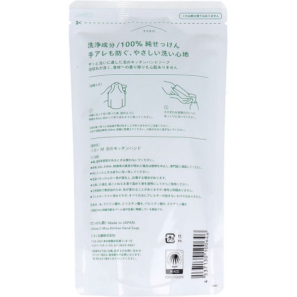 【無添加 泡のキッチン ハンドソープ リフィル 220mL】広告文責(有)イースクエアTEL:0120-532-772ミヨシ石鹸株式会社個装サイズ:110X200X55mm個装重量:約230g内容量:220mLケースサイズ:27.5X22.5X23cmケース重量:約6.2kg製造国:日本