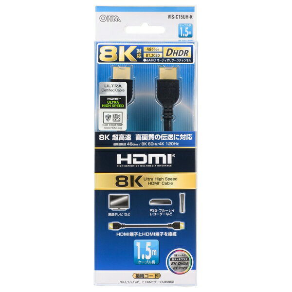 【8K/4K/2K対応】ウルトラHDMIケーブル(イーサネット対応/無鉛はんだ使用/1.5m/ブラック)・型番: VIS-C15UH-K・JANコード: 4971275505445・販売元: (株)オーム電機