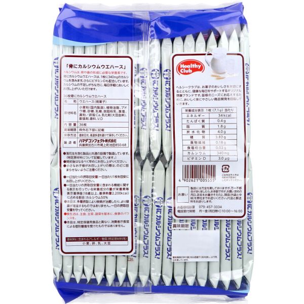 【ヘルシークラブ 骨にカルシウムプラス! ウエハース バニラ味 36枚入】広告文責(有)イースクエアTEL:0120-532-772ハマダコンフェクト株式会社個装サイズ:193X320X40mm個装重量:約284g内容量:36枚入ケースサイズ:29.5X22X40.5cmケース重量:約3.25kg