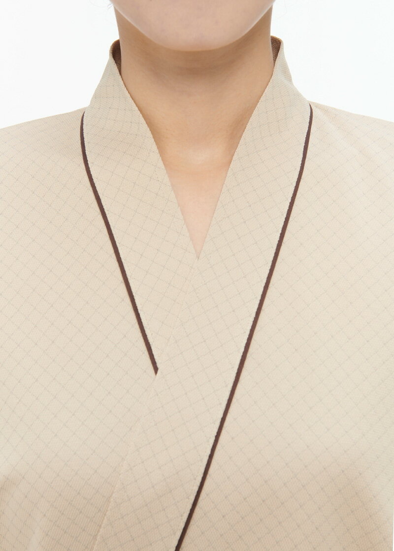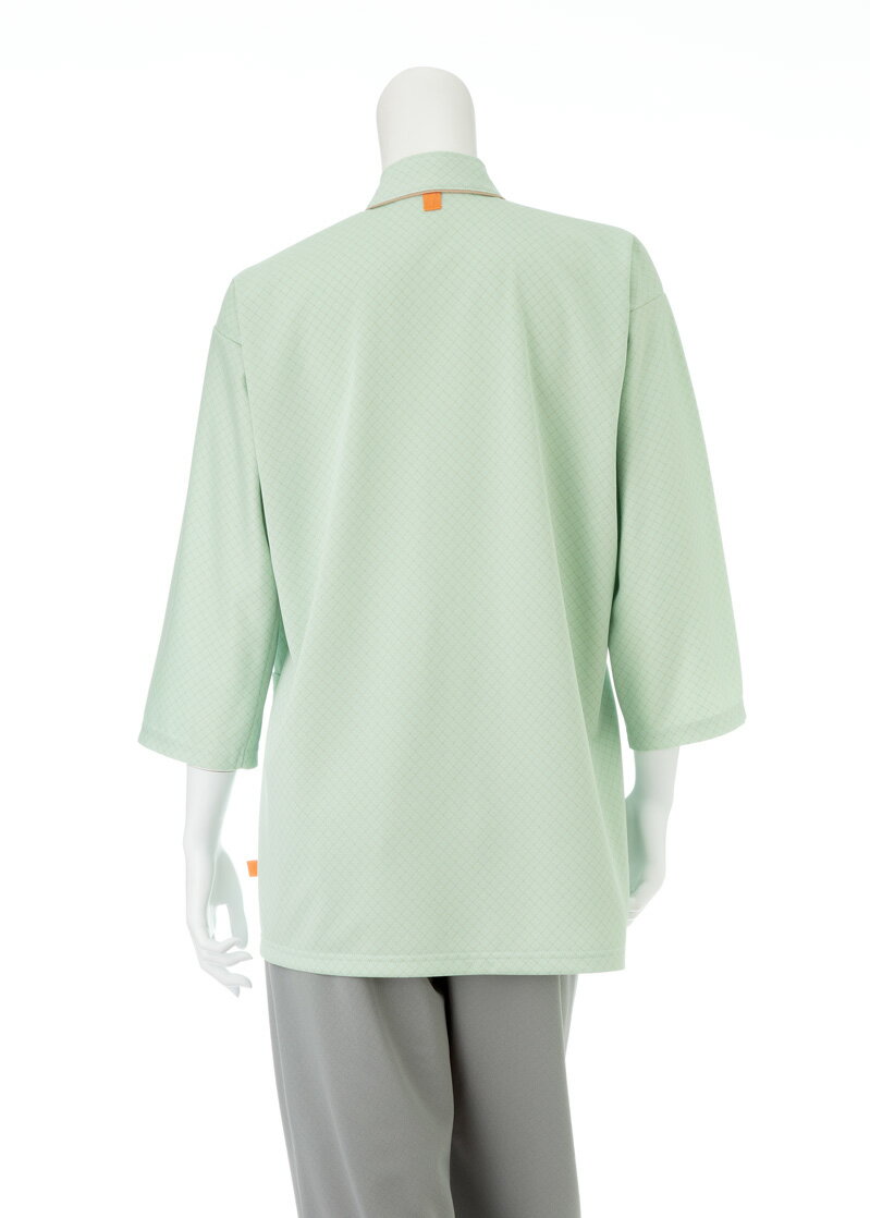 ●キルティングをイメージした格子柄のソフトでふくらみ感のあるニット素材を使用したじんべい型の患者衣です。